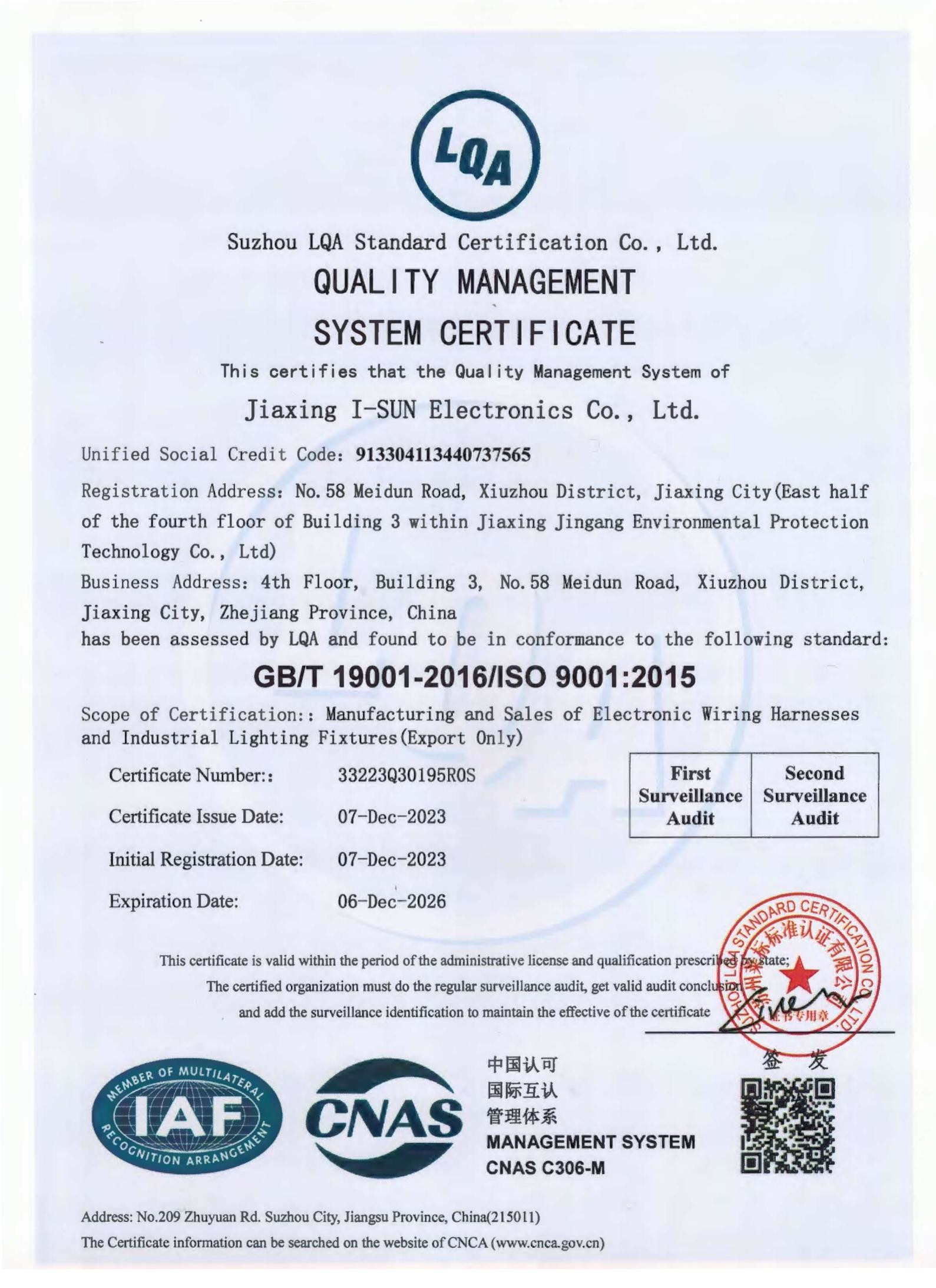 工廠嚴格執(zhí)行ISO9001:2015品質(zhì)管理標準,建立了從進料(IQC),制程(IPQC)終檢(FQC),到出貨(OQC),及品質(zhì)改善等完善的品質(zhì)管理體系。擁有5條生產(chǎn)線,能完成從裁線、焊接、端子壓接、到組裝、測試全生產(chǎn)過程,產(chǎn)品材料符合UL、CE、CSA等認證要求,符合ROHS環(huán)保相關(guān)規(guī)定。