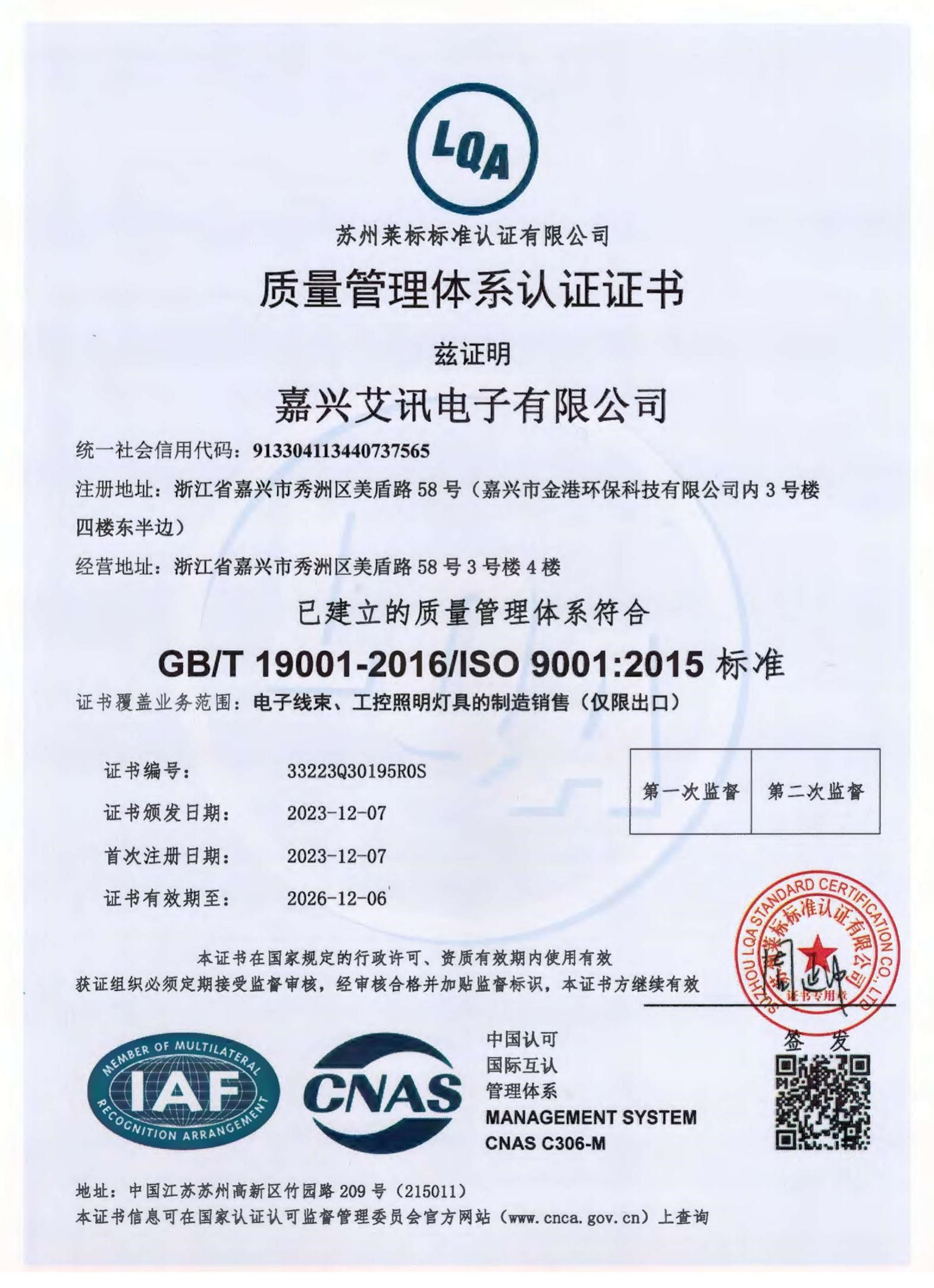 工廠嚴格執(zhí)行ISO9001:2015品質(zhì)管理標準,建立了從進料(IQC),制程(IPQC)終檢(FQC),到出貨(OQC),及品質(zhì)改善等完善的品質(zhì)管理體系。擁有5條生產(chǎn)線,能完成從裁線、焊接、端子壓接、到組裝、測試全生產(chǎn)過程,產(chǎn)品材料符合UL、CE、CSA等認證要求,符合ROHS環(huán)保相關(guān)規(guī)定。